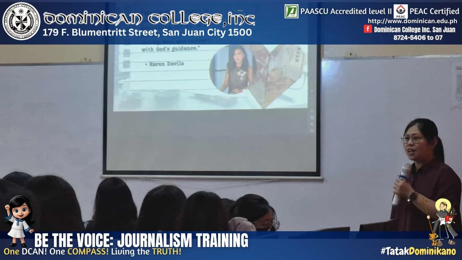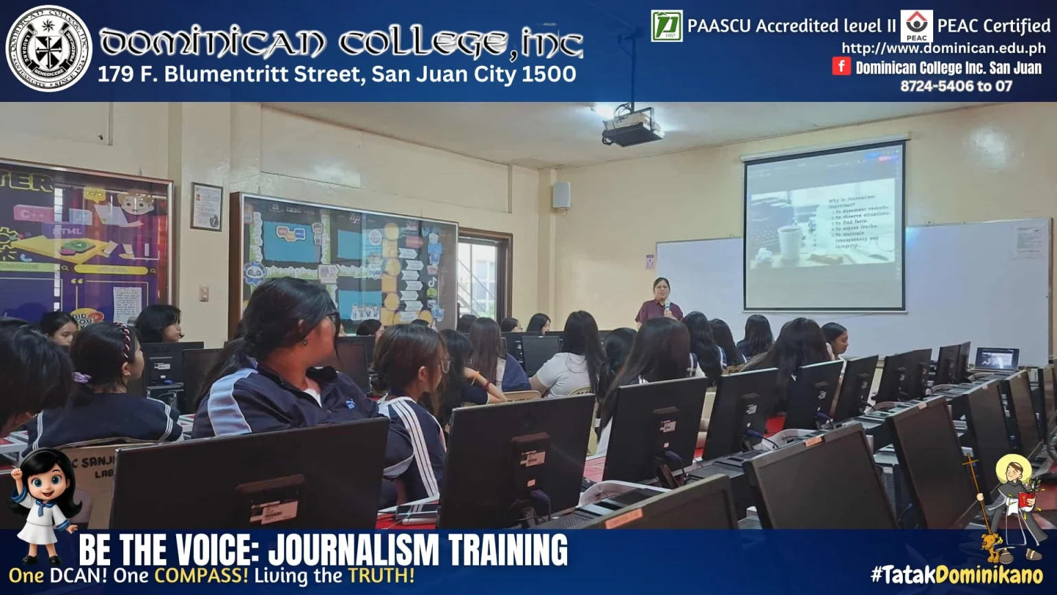Last November 14, 2025, our young campus journalists attended an inspiring and empowering training titled “Be the Voice: Using Journalism to Tell the Truth and Inspire Change,” held at the Dominican College Computer Laboratory with our esteemed speaker, our very own alumna, Fleurdeliz R. Altez-Albela, Ph.D.