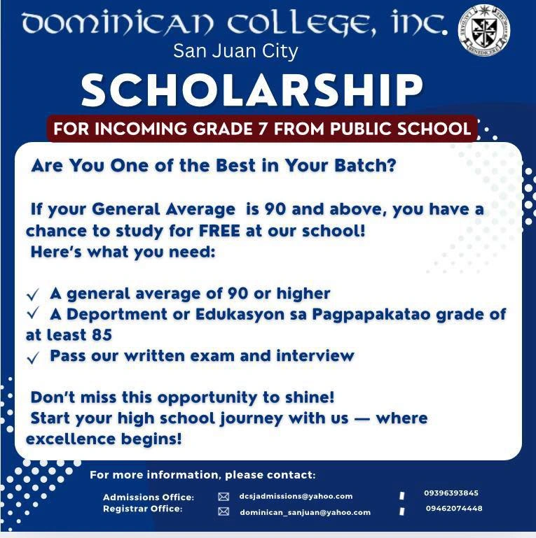 Got a grade of 90 or above? Grab this golden opportunity to study for FREE at Dominican College, San Juan City!