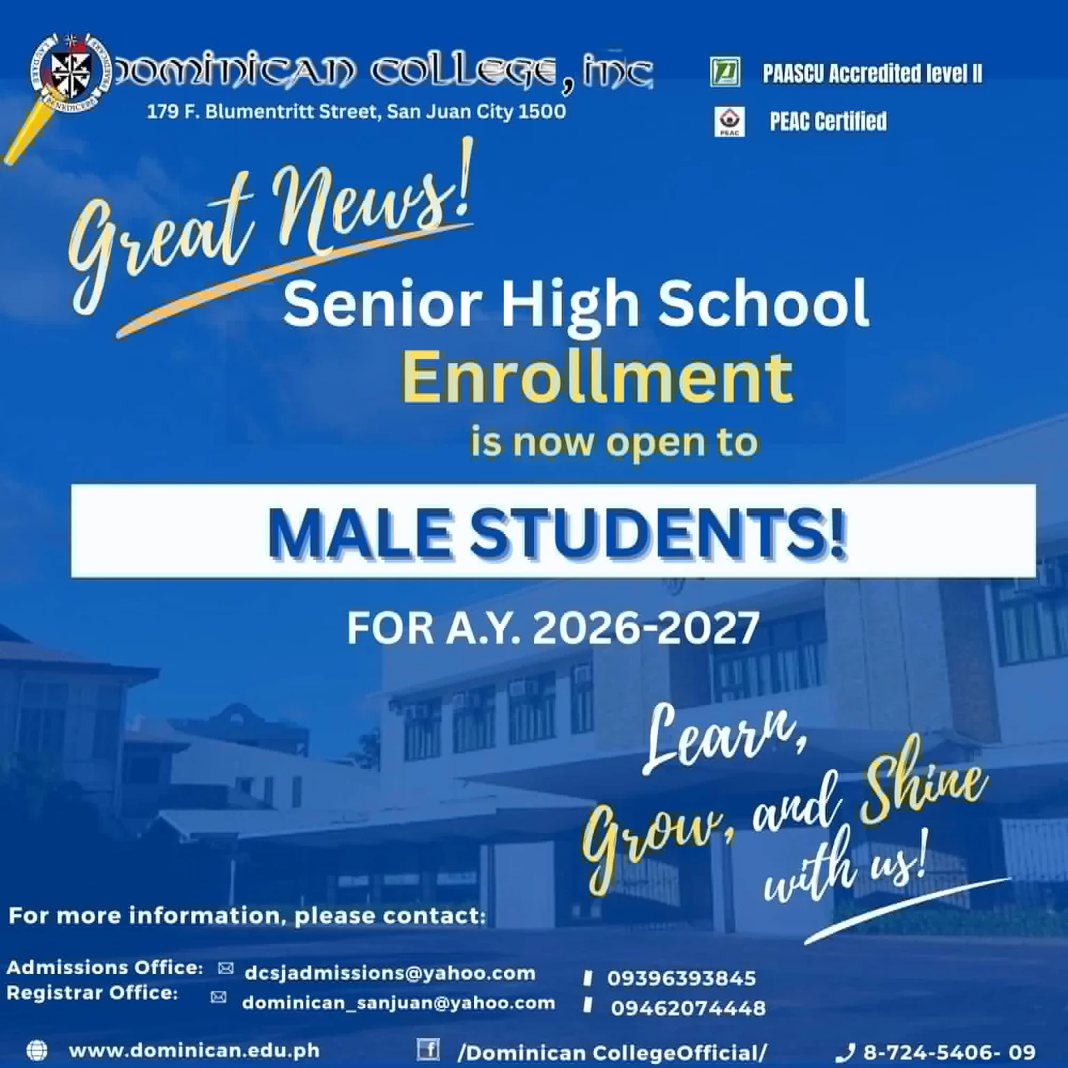 Got a grade of 90 or above? Grab this golden opportunity to study for FREE at Dominican College, San Juan City!